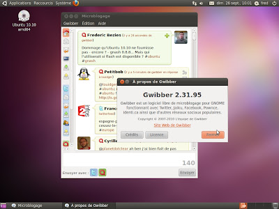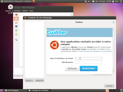Coté logiciel, on peut noter la présence d’un certain Gwibber 2.31.95 (alors que la version courante est la 2.31.94 au moment où je rédige cet article). Application dans laquelle Ubuntu semble s’investir énormément… Surtout quand on demande l’autorisation pour se connecter à un compte twitter.