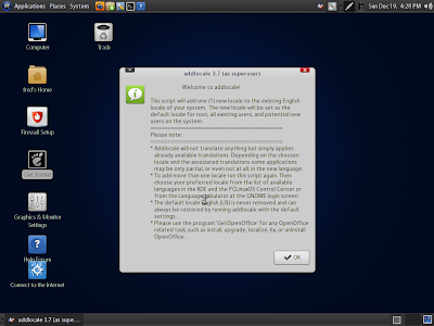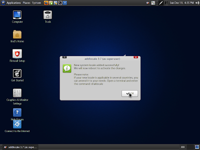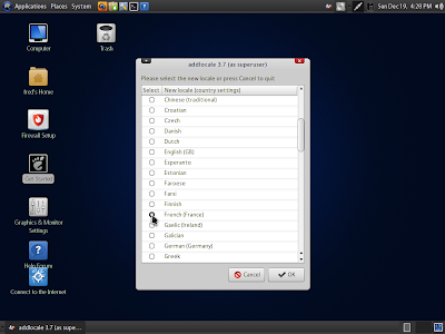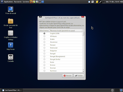 L’étape suivante : mettre en français l’interface et les logiciels. Il faut aller dans le menu System / Administration / Localization manager… Et suivre le guide. Le clavier, ainsi que le fuseau horaire sont configurés. Dommage cependant qu’un simple duo déconnexion / reconnexion ne soit pas proposé 🙁