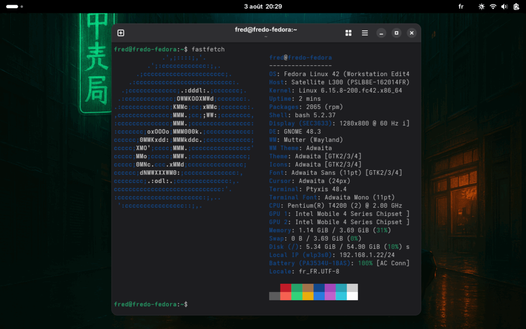 J’ai ensuite transféré mon fond d’écran vers la Fedora Linux. Et j’ai lancé Fastfetch pour prouver l’utilisation d’une Fedora Linux en dur.
