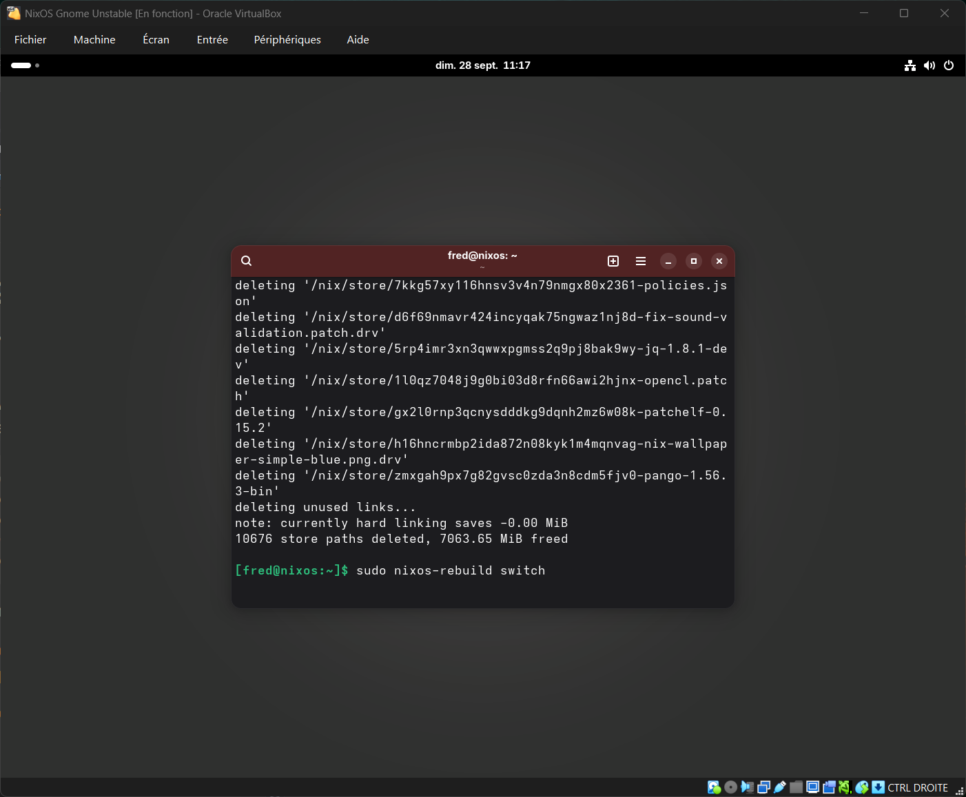 J’ai une fois démarré sur la branche unstable décidé de virer la base stable qui ne me servait à rien avec un sudo nix-collect-garbage -d. J’ai juste récupéré 7 Go au passage… Capture d’écran à l’appui.