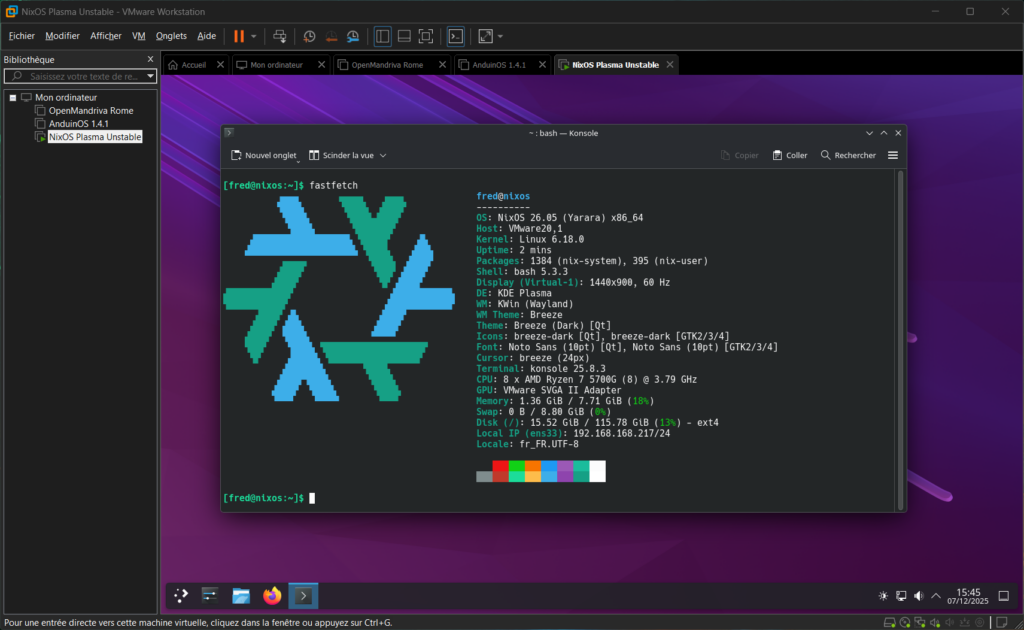 Et pour finir, l’indispensable fastfetch qui prouve bien que la machine virtuelle est en préversion 26.05.
