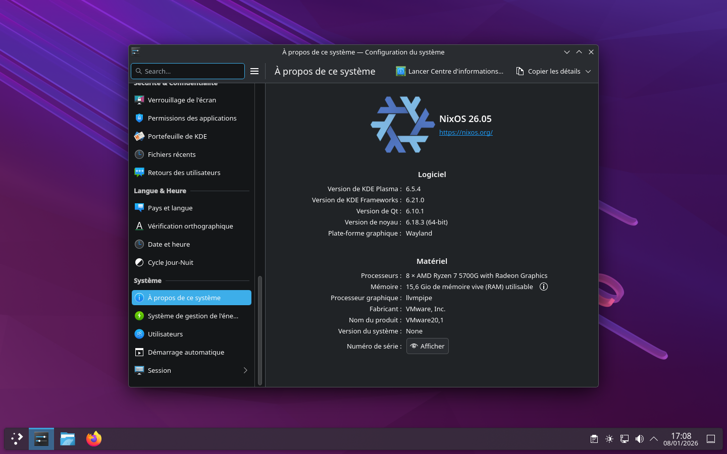 Il y a un mois, le 7 décembre 2025, je me disais : et si je testais une NixOS unstable en machine virtuelle. Cette fois, j’ai pris Plasma pour varier un peu les plaisirs.