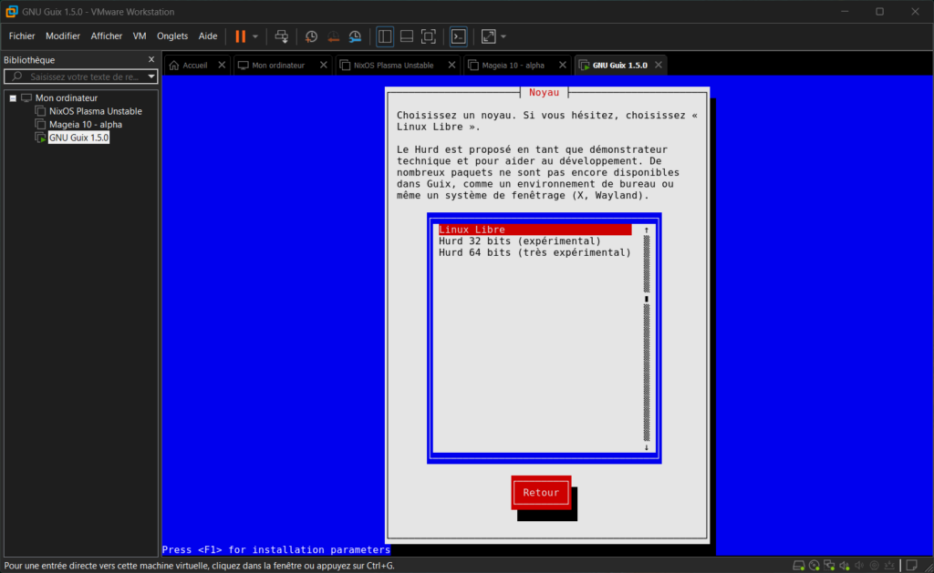 Après avoir récupéré l’image ISO de la version 1.5.0, j’ai lancé l’installateur en mode semi-textuel qui fonctionne très bien. J’ai surtout esquisser un sourire d’incompréhension quand j’ai vu que dans les choix de noyaux, il y a le duo GNU Hurd 32 et 64 bits. Je vous laisse apprécier la surprise avec la capture d’écran ci-dessous.