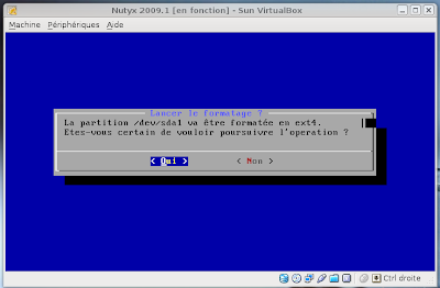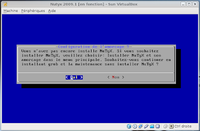 Une fois le formatage effectué, on a l’option d’installer grub sans installer la distribution. On répond non, puis l’installation va s’effectuer, quand on choisi « Installer NuTyX ».