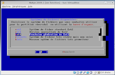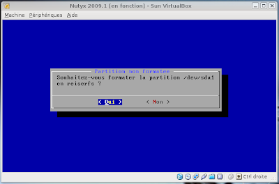 L’écran change et nous propose plusieurs options, dont le formatage de la partition. Même si l’option par défaut est ReiserFS, on peut très bien utilisé ext2, 3 voire même ext4fs pour la partition principale.