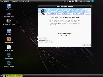 Après un écran de démarrage qui permet de choisir la résolution, la langue utilisée ou encore une option – comme lancer directement l’installateur, on arrive sur un Gnome 2.28.0.