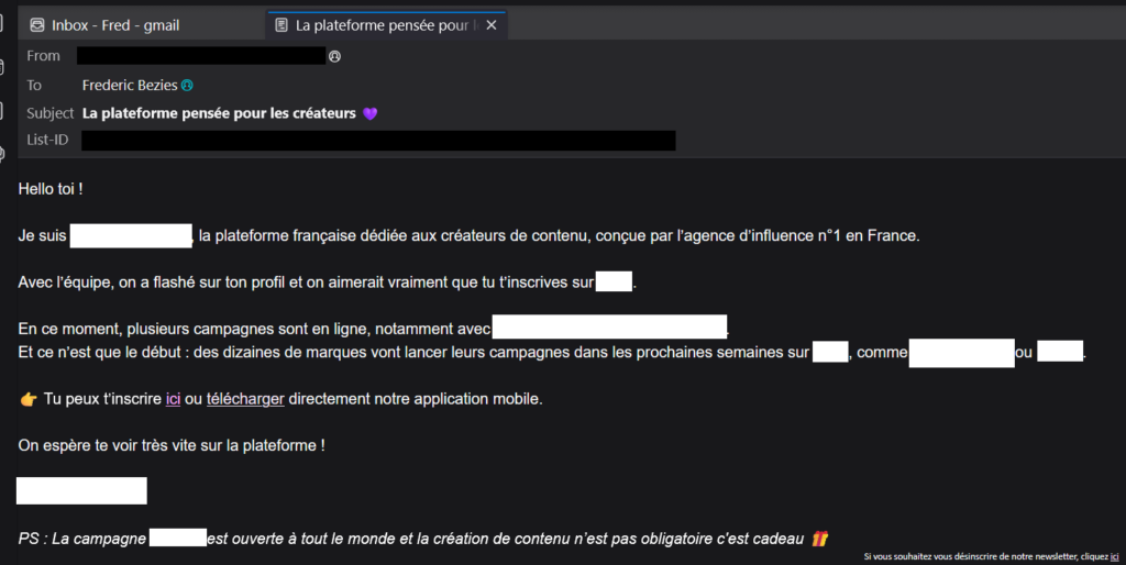 J’ai comme l’impression que c’est un courrier pré-rempli et complété avec une base de données un peu bizarre. En quoi mon profil – abandon de YouTube en novembre 2018 – pourrait être intéressant ?